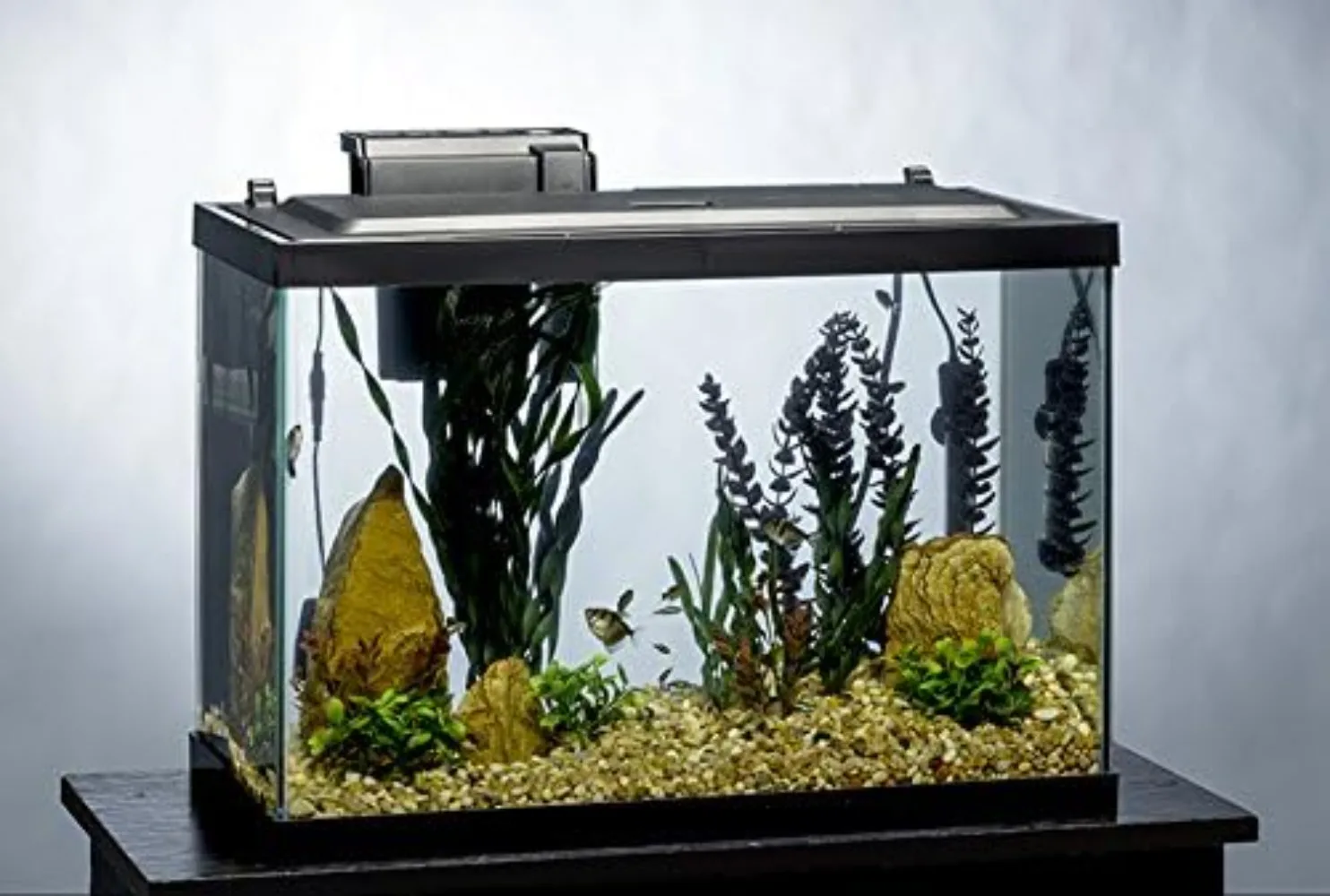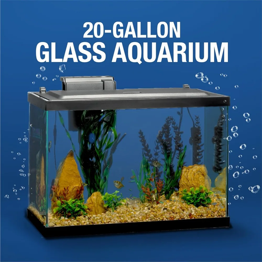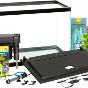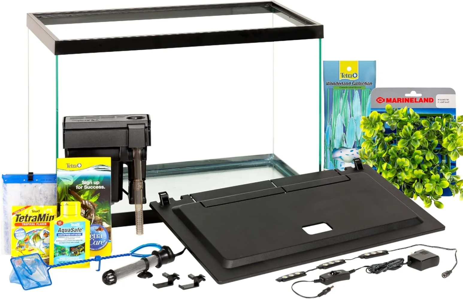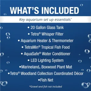 - The Tetra Kit includes: one 20 Gallon Glass Aquarium, one LED hood, one Tetra Mini UL Heater, one Tetra Whisper 20 Filter, one artificial Boxwood Plant Mat, four artificial plants. Add gravel and fish to complete your aquarium